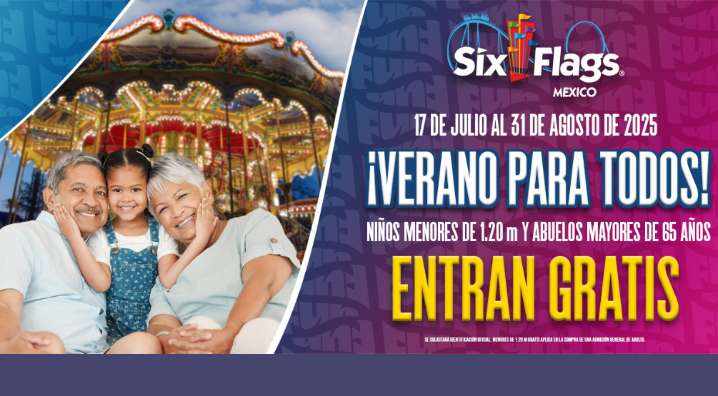 *Cada menor de 1.20 m gratis aplica en la compra de una Admisión de adulto. Promoción de abuelos mayores de 65 años gratis aplica presentando identificación oficial.