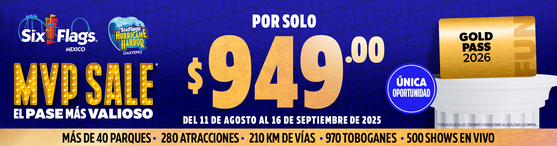 En lastaquillasde Six Flags México o Hurricane Harbor Oaxtepec losPases Anuales pueden comprarse a Meses Sin Intereses(no aplica encompras en línea), y solo aplica durante MVP Sale. Consulta las tarjetas de crédito aplicables, así como los montos mínimos yrestricciones en nuestro chat en vivo, línea telefónica o directo en la taquilla.